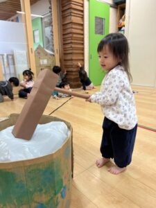 杵と臼を使って昔ながらの餅つきの真似っ子をぱんだ組さんは経験