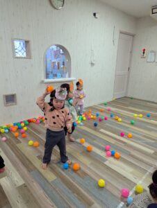 遠くから「鬼は外〜!!」とボールを投げる子や、 鬼のお口の中に優しくポイッとボールを入れる子もいましたよ(^ ^)